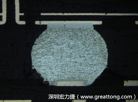 通常拿到一張BGA的切片照片時,第一個要判斷的就是那一邊屬于BGA的封裝面,那一邊又是屬于電路板組裝面。對于這個問題,我的方法是從銅箔的厚度來做判斷,銅箔比較厚的那一面通常是電路板組裝面,因為BGA封裝的載板通常都比電子組裝的電路板來得薄,所以會選用比較薄的銅箔厚度。